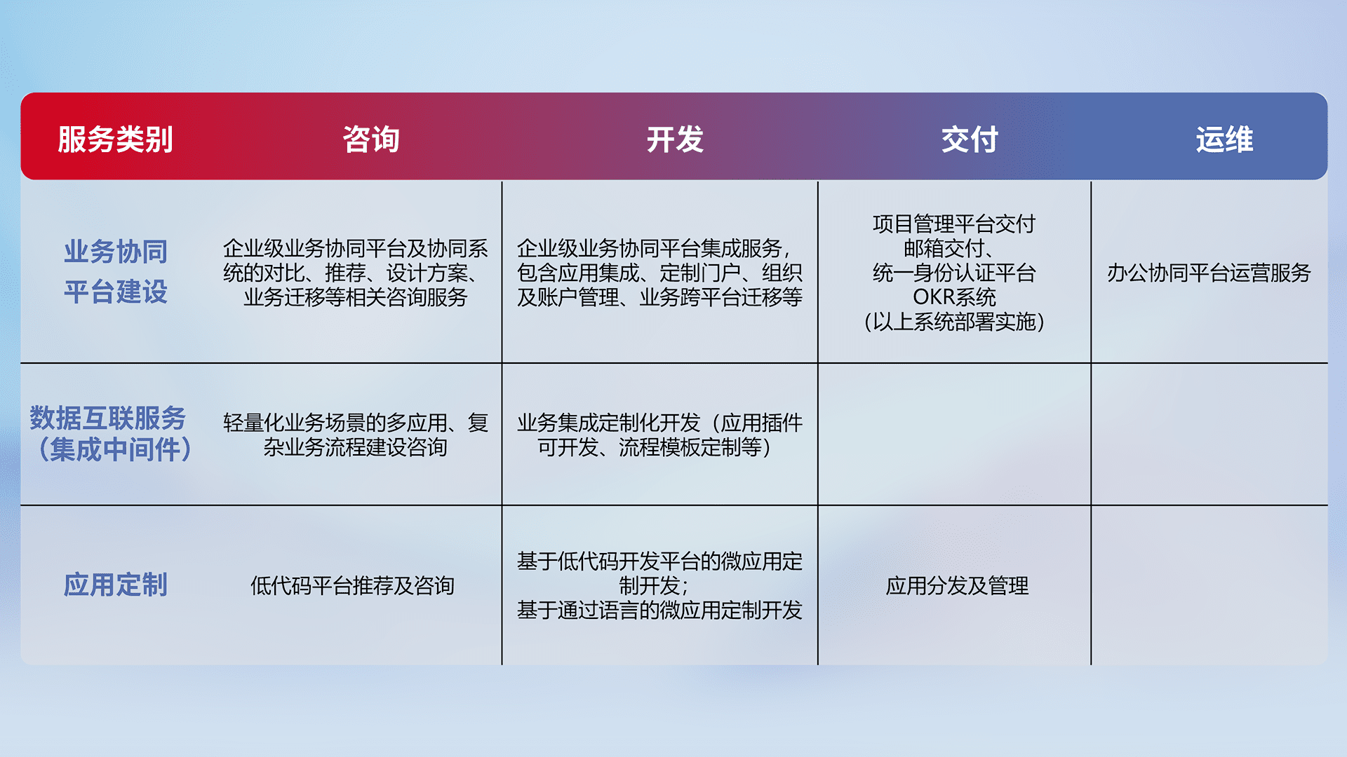 针对钉钉、、、、企微、、、、IDaas等平台级产品提供产品的规划、、、、方案、、、、交付、、定制化开发等服务,,,,实现如统一协同办公、、、、智能客户服务、、、、混合会议管理、、智能数据查询、、、等业务场景,,实现数字化转型。。。